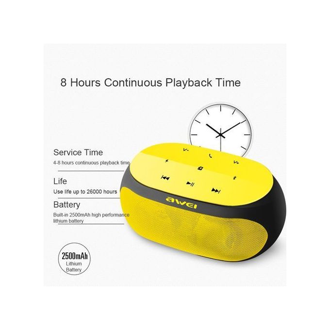 Specifications: Brand :AWEI Model :Y200 Color : Yellow, White, Red, Gold, Rose Gold Audio Input : AUX, TF Card, Bluetooth Apply for : Mobile Phone, Tablet, All bluetooth devices Technical Parameters: Input Power: 3.7V or extraposition DC 5V Output Power: 4.5W x 2 Built-in Battery Capacity: 2500mAh Work Time : 4-8h Charging Time: 1.5-2h Channels: 2.0 Bluetooth Version: V3.0 Bluetooth Protocol: A2DP/AVRCP Transmission Range: 10m Package Included: 1× AWEI Y200 Speaker 1× USB charging cable 1× Audio Cable 1× Manual